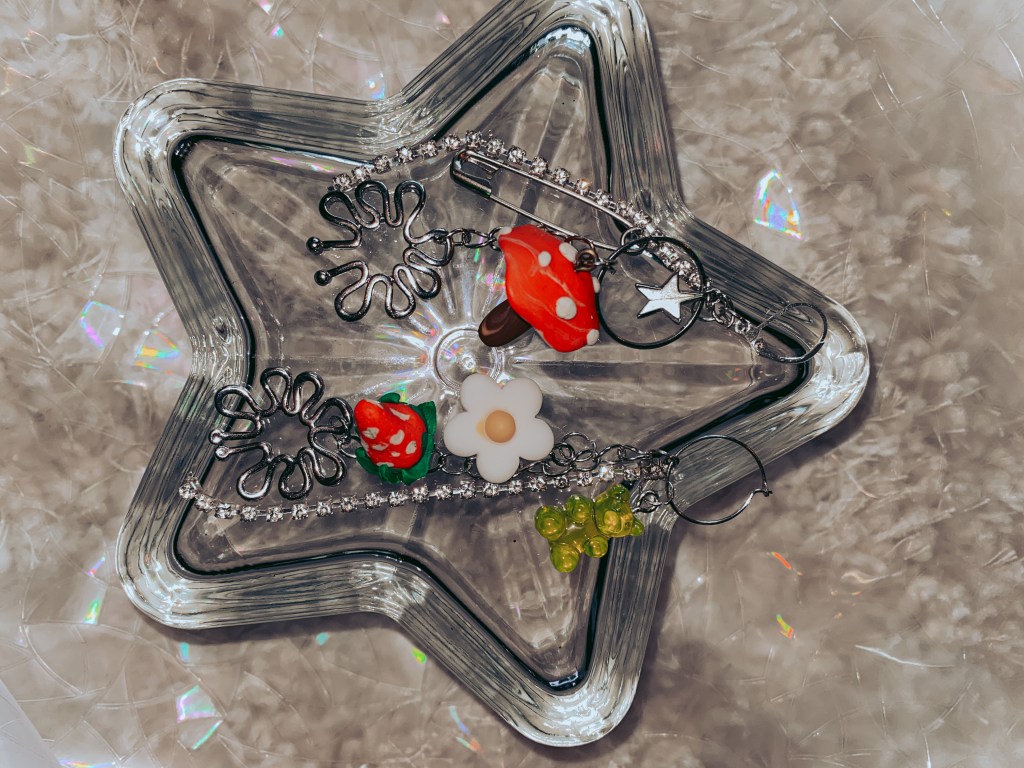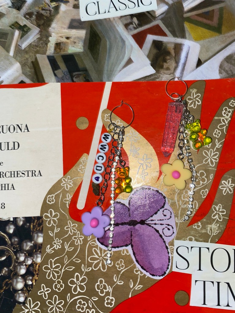 These special earrings were created with Harry Styles in mind. Created out of miscellaneous charms and missing earrings. A completely sustainable earring with intentions of creating something new out of a lifeless item.