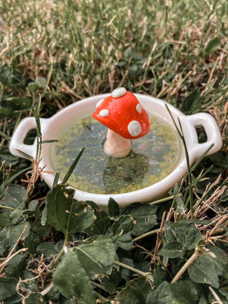 This is a repurposed ashtray which has been changed into a magical fairy garden using resin and handcrafted clay works.